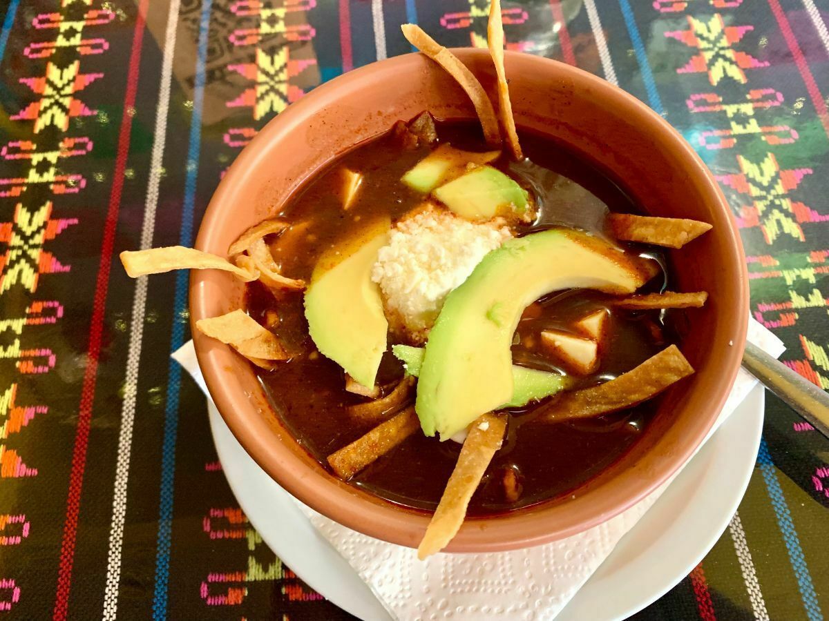 I ordered soup and tacos. The tortilla soup arrived and I hadn’t expected this depth of colour to the broth. Could it be beef? I’ve always been a soup guy and I pride myself on being adept in this department but what I’m learning from the Mexican kitchen is that there are some recipes that require no animal protein at all for the stock.