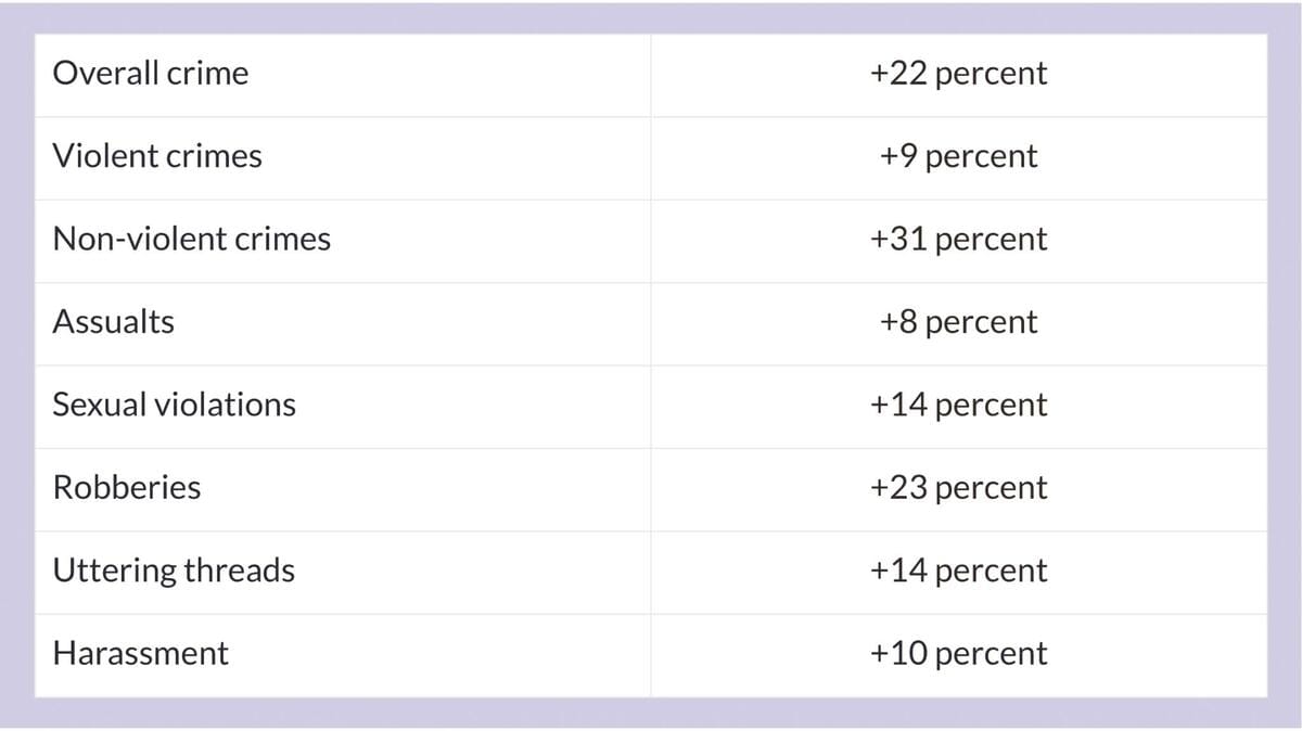According to the Citizen from 2019 to 2021, violent crime dropped 10.2 percent, non-violent crime dropped 18.9 percent, and the crime severity index dropped 12.4 percent.