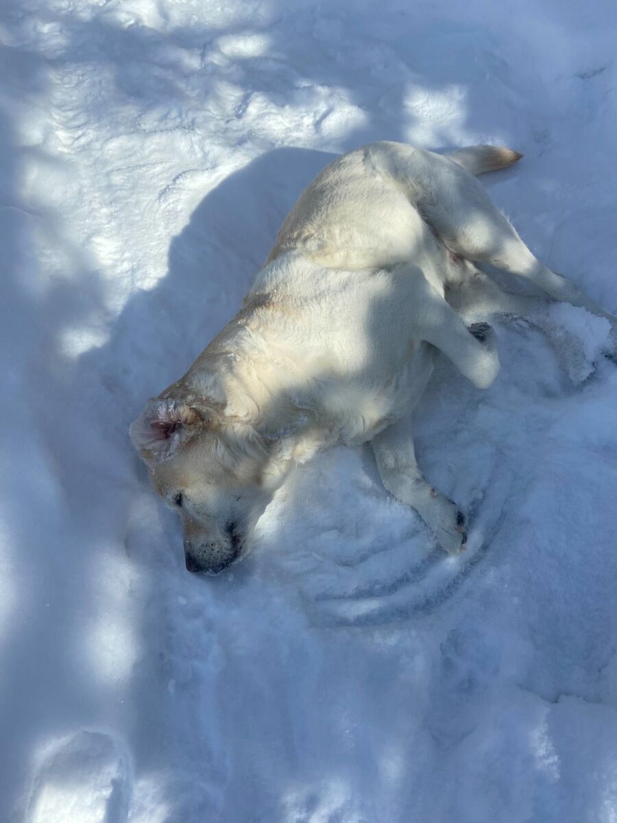 Today’s photo comes courtesy of Jenny Papadopoulos. “Our nine-year-old yellow lab Baxter making a snow angel for the Snowsuit Fund’s 2023 Snow Angel Challenge.” He’s doing a very good job!