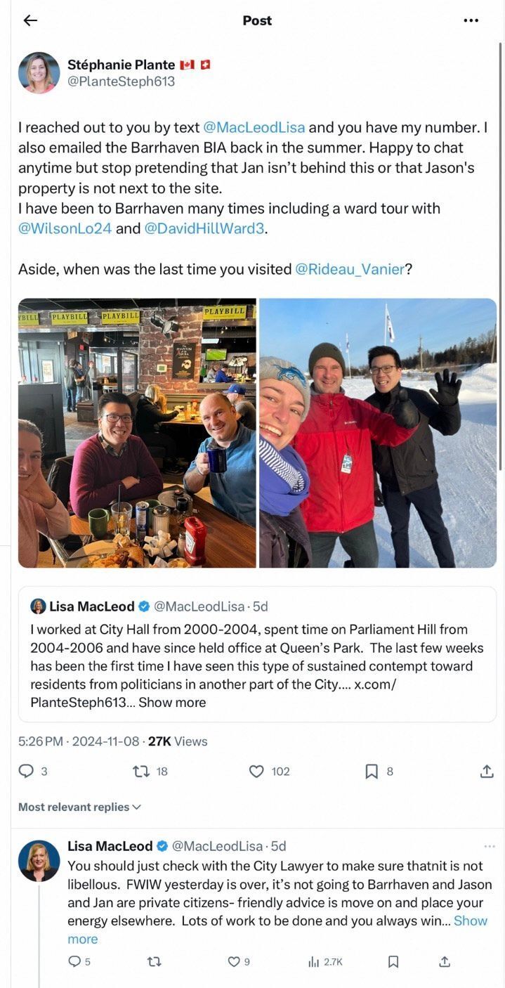 Quoting one of MacLeod’s tweets, Plante said: “I have reached out to you by text @MacLeodLisa and you have my number. I also emailed the Barrhaven BIA in the summer. Happy to chat anytime but stop pretending that Jan isn’t behind this or that Jason’s property is not next to the site.”