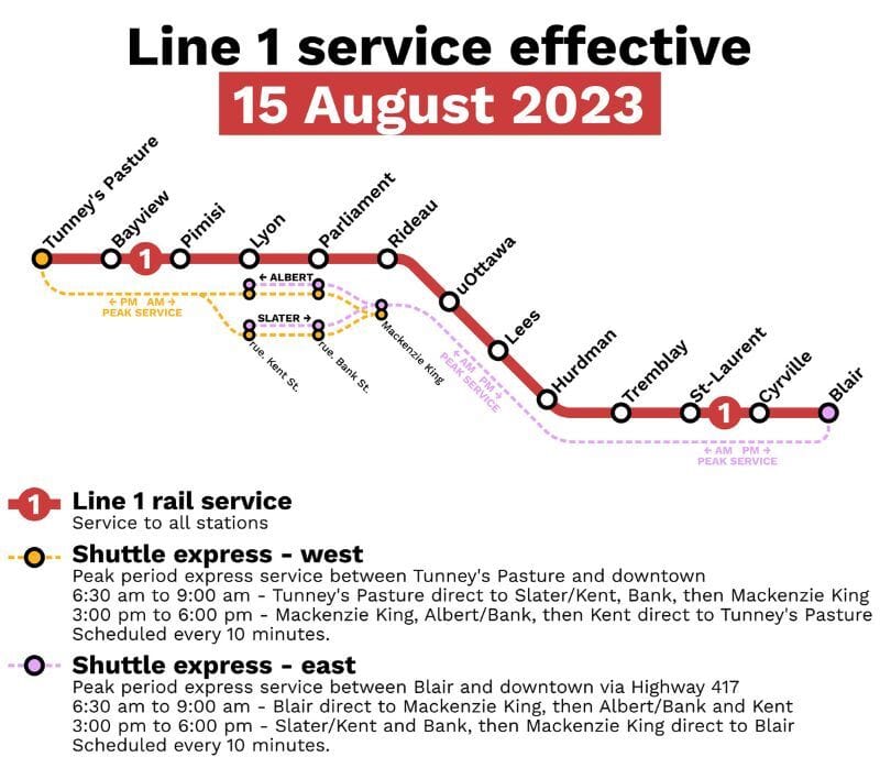 The Shuttle Express buses are a rebrand of the R1 express buses that were unveiled during the 28-day LRT shutdown. The buses will run every 10 minutes during morning and evening rush hour, transit boss Renée Amilcar said in a memo. The buses run from Tunney’s Pasture and Blair to the main stops downtown.