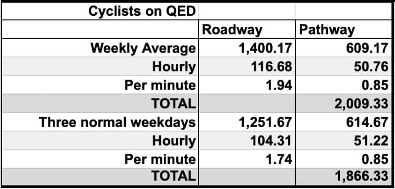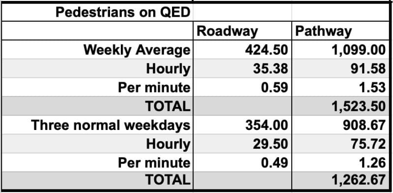 Lookout’s analysis: During the three days, 1.94 cyclists used the road every minute, and 0.85 are using the pathway. About 2.3 times the number of cyclists are using road than the pathway. At the same time about 0.49 pedestrians are using the QED roadway every minute, while 1.26 are using the pathway. About 2.6 times more pedestrians are using the path instead of the road, a similar pattern but in reverse.