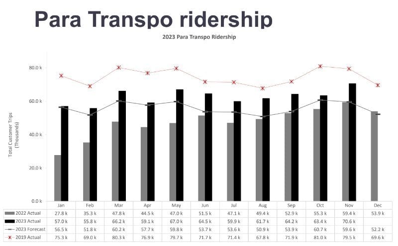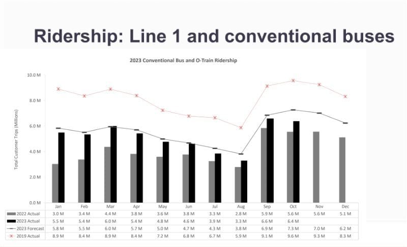 ParaTranspo: Meanwhile, ParaTranspo ridership is above levels forecast for the year. Ridership in the first 11 months of the year is 11.5 percent above expected levels.