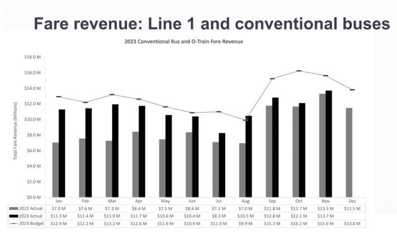Fares: Revenue is still well below budgeted levels, and only slightly above 2022 levels. In November the city expected fares to bring in $15.6 million, but the actual number was $13.7 million, slightly above last year’s $13.3 million. Ridership was also less than expected.