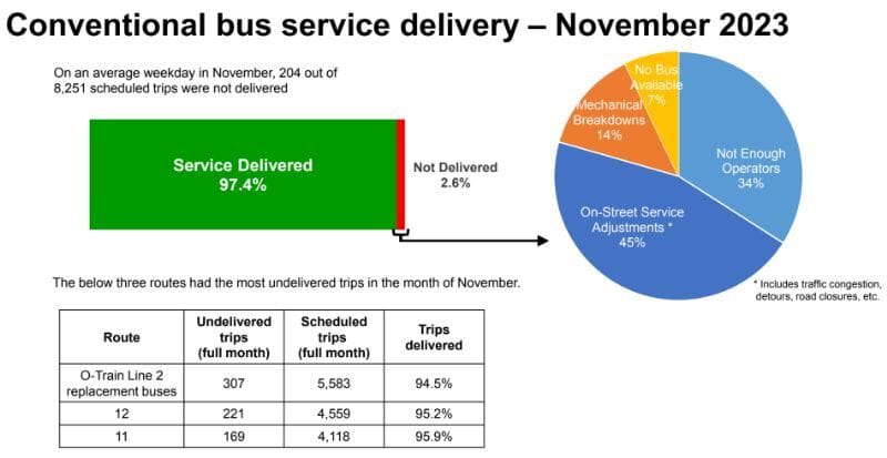 Transit performance: Overall, buses continue to struggle in the city. On-time performance was 73 percent in November, similar to the previous month. Every day an average of 204 trips are cancelled, according to OC Transpo figures, meaning service is delivered 97.4 percent of the time. The agency has a goal of 99.5 percent service delivery.