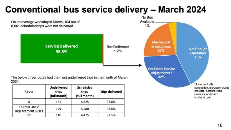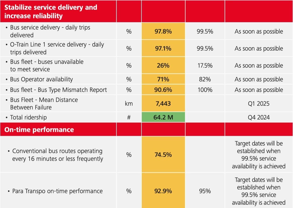 Falling behind: On metrics of service delivery, bus and operator availability, reliability, and more, OC Transpo is falling short, the agency said in an annual update to several key metrics. The measurement is part of a new five-year plan to improve service.