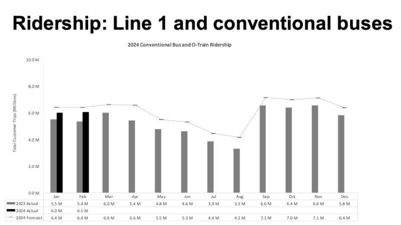 What happened: The ridership woes continue at OC Transpo, as fewer people are taking the bus and train than the transit agency projected. Ridership in February was 6.1 million trips, 4.7 percent below the projected 6.3 million, according to a report to council.