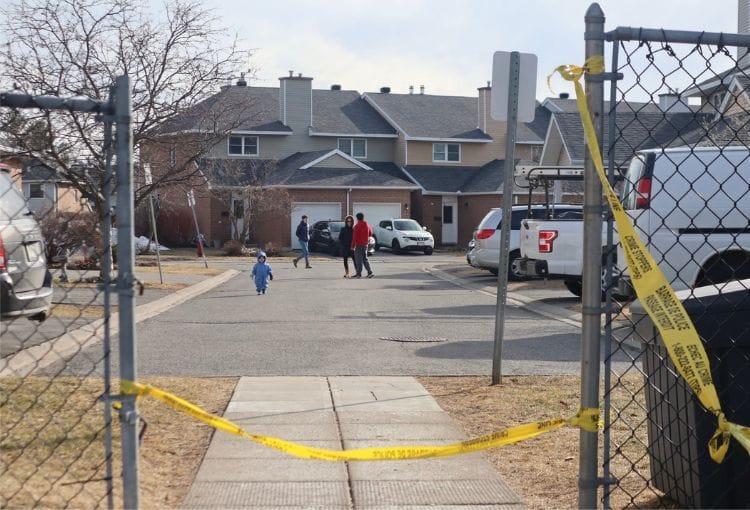 Police tape blocks off a Barrhaven townhouse development where 61-year-old Brenda Rus was killed Saturday night. Photo by Charlie Senack.