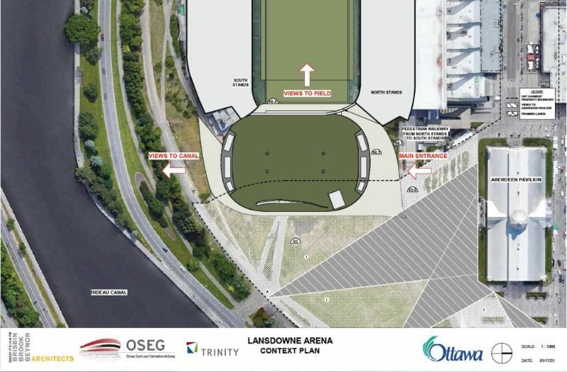 The $322-million proposal from Ottawa Sports Entertainment Group (OSEG) — who own the 67’s and Redblacks and operate the site — would see a new arena built on the east side of the football field. The arena would be sunk into the ground and have a green roof, but that roof would be off limits to the public. (It would cost more for it to be able to support that sort of weight.)