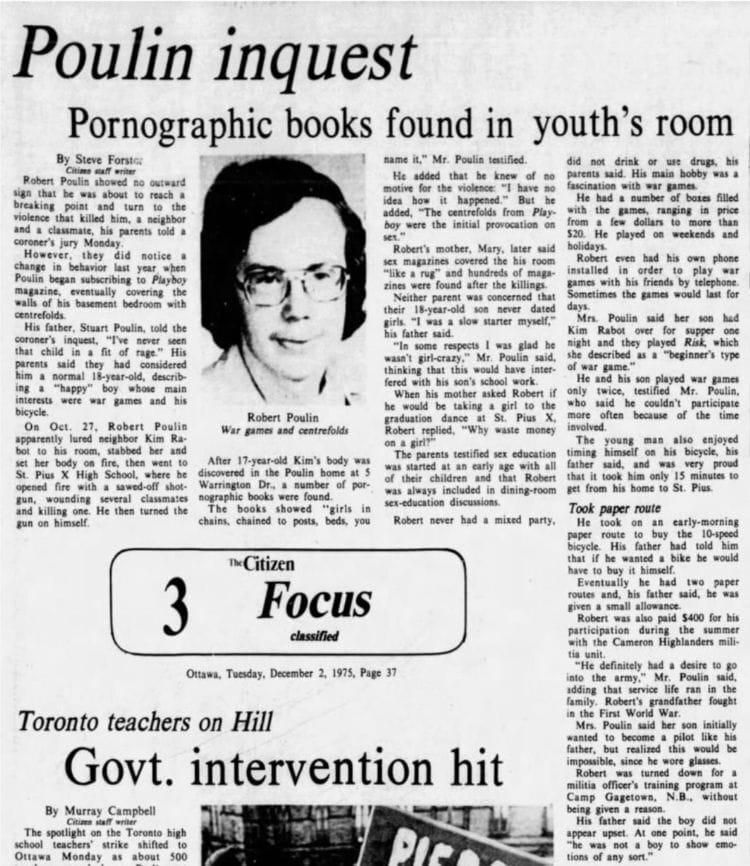 But that was not the only horror to unfold. Just as Poulin arrived by bike at his Catholic high school, firemen were responding to a blaze in his parents’ basement on Warrington Drive in Old Ottawa South. Once the fire was extinguished, they found the body of 17-year-old Kim Rabot wearing nothing but a jacket and shackled to the bedpost. She was raped and stabbed to death before Poulin tried to burn the evidence.