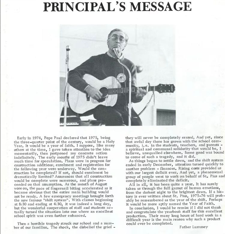 The principal’s message in the 1975-76 St. Pius High School yearbook.