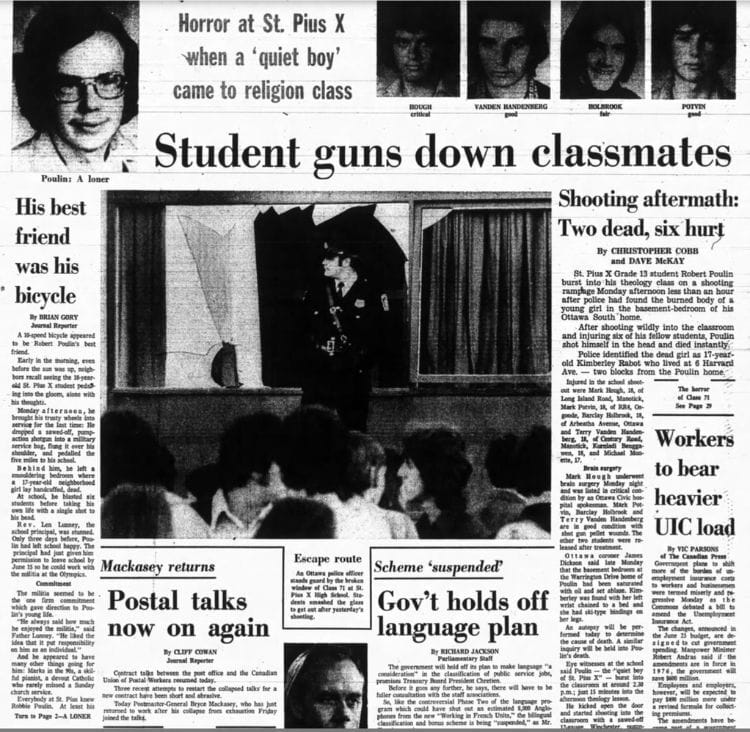 There was no explosion. Robert Poulin, an 18-year-old quiet but academic student, stormed into room 71, pulled a sawed-off shotgun out of his duffel bag, and began shooting at the ceiling. He then stepped out into the hall and took his own life.