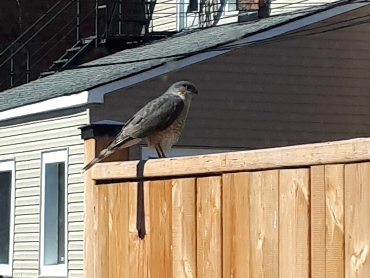 Reader Jennifer Cooke sens in this photo of some kind of bird of prey — I’ve got no practice at identification, so I won’t try — who decided to see what all the fuss about Jennifer’s birdseed was about. Not every day you get to see a bird like this.