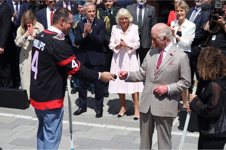 Former Ottawa Senators player Chris Phillips does a ceremonial puck drop with King Charles as Prime Minister Mark Carney and Queen Camilla look on. Photo by Charlie Senack.